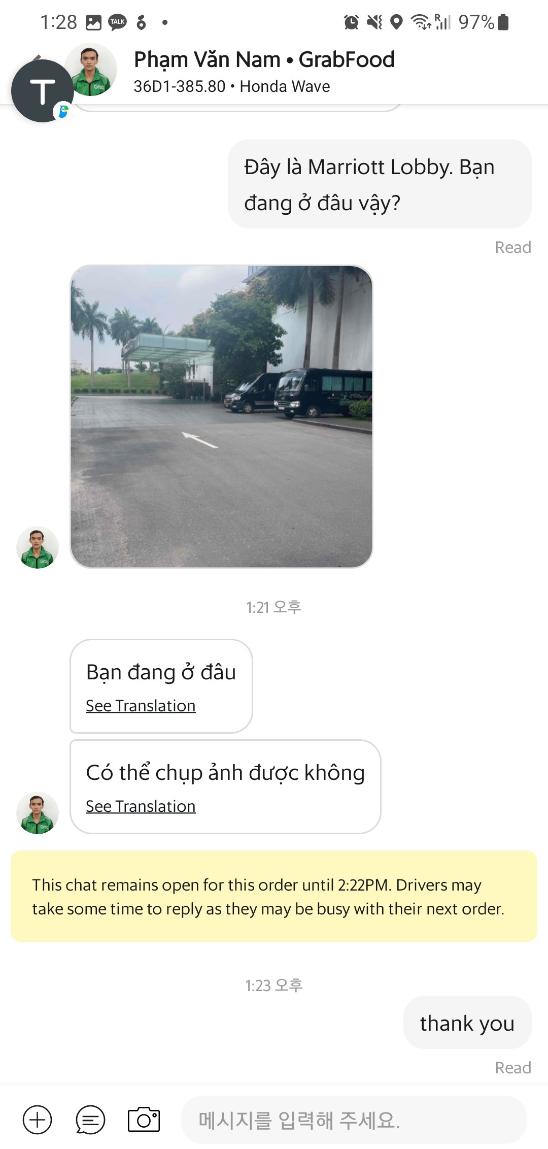배달기사가 출발할 때 채팅창으로 아래와 같이 알려주었습니다.